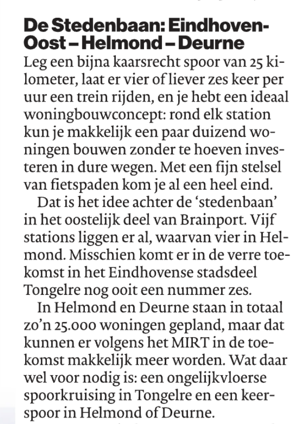Fig. 3. Het stond ook letterlijk in het Eindhovens Dagblad van 17 januari: “De stedenbaan Eindhoven-Helmond-Deurne. Laat er vier of liever zes keer per uur een trein rijden, en je hebt een ideaal woningbouwconcept: rond elk station kun je makkelijk een paar duizend woningen bouwen zonder te hoeven investeren in dure wegen.”