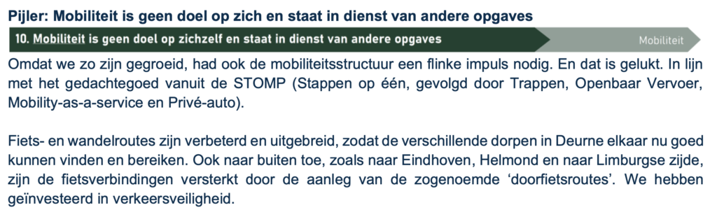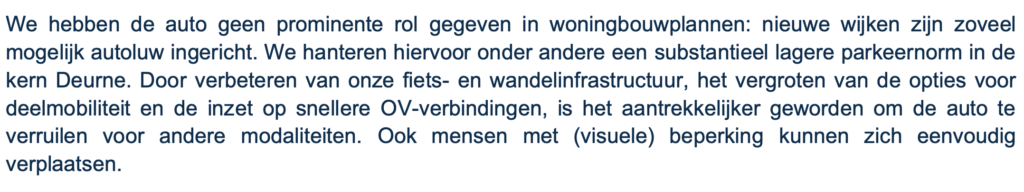 Het college kiest voor autoluwe wijken. Het college kiest voor het verlagen van de parkeernorm. Het college kiest voor het terugdringen van het autogebruik. Naast de autoluwe wijken en lagere parkeernorm moeten nieuwe woningen in Deurne met name in een straal van 15-minuten fietsen van het station komen.