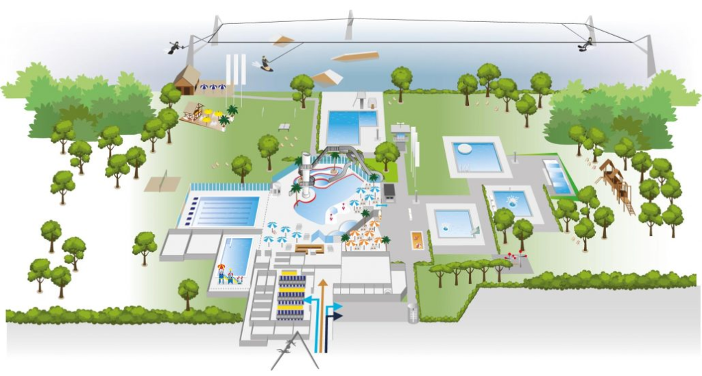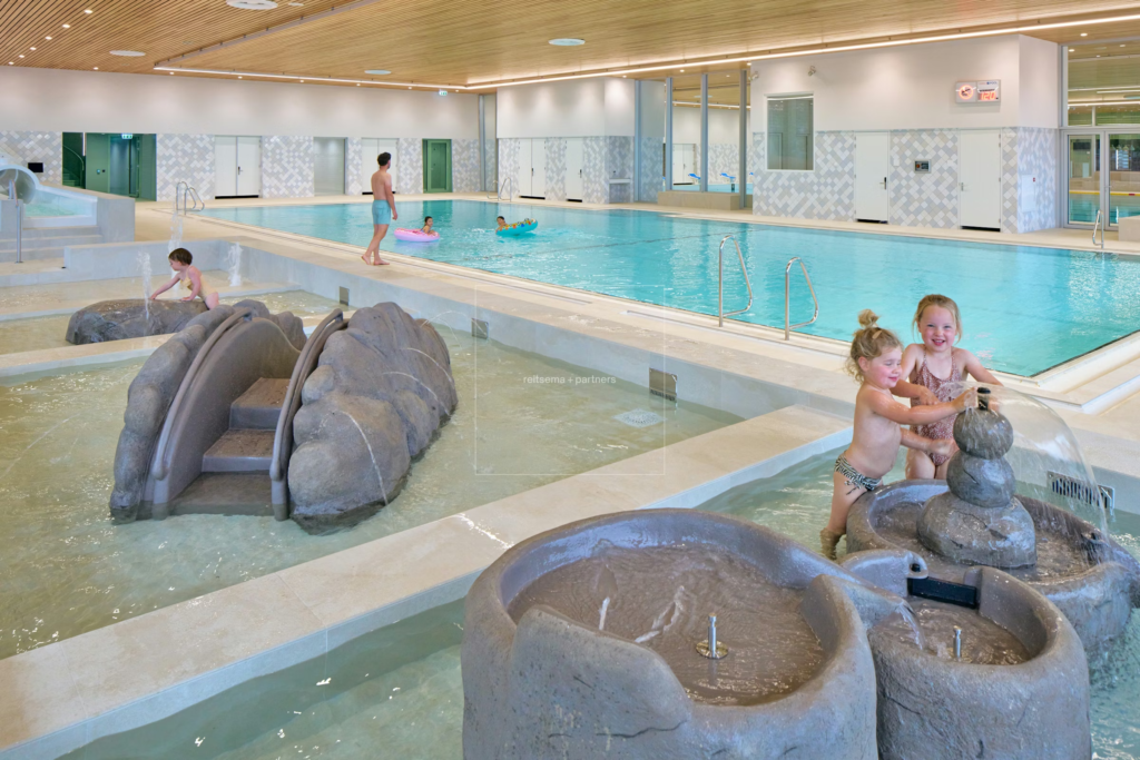 - Golfslagbad (met stroomversnelling, bubbelbad, peuterbad en 72 m interactieve glijbaan)